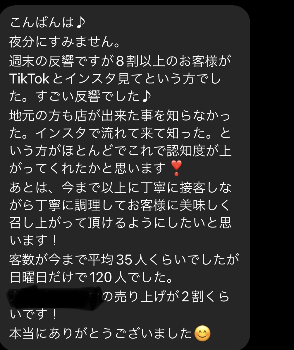 2月後半からサポートさせて頂いてる焼肉屋さんは、インスタやTikTokで投稿してから一気に予約が入り3月着地予測で2月売上から150万円以上の上のせをする勢いお客様が来ています。