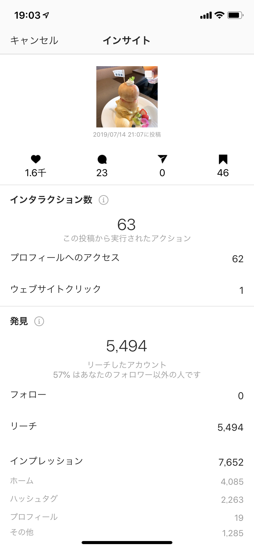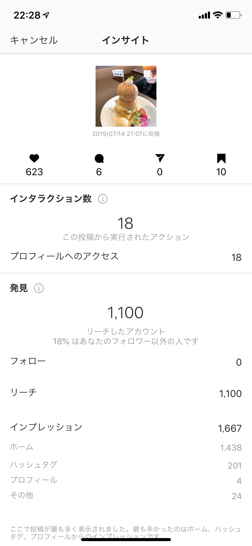 どんどんフォロワー以外のリーチが増えてる事がわかります。ハッシュタグ経由で流入が2200を超えました。フォロワー以外のリーチしたアカウントは57パーセントです。